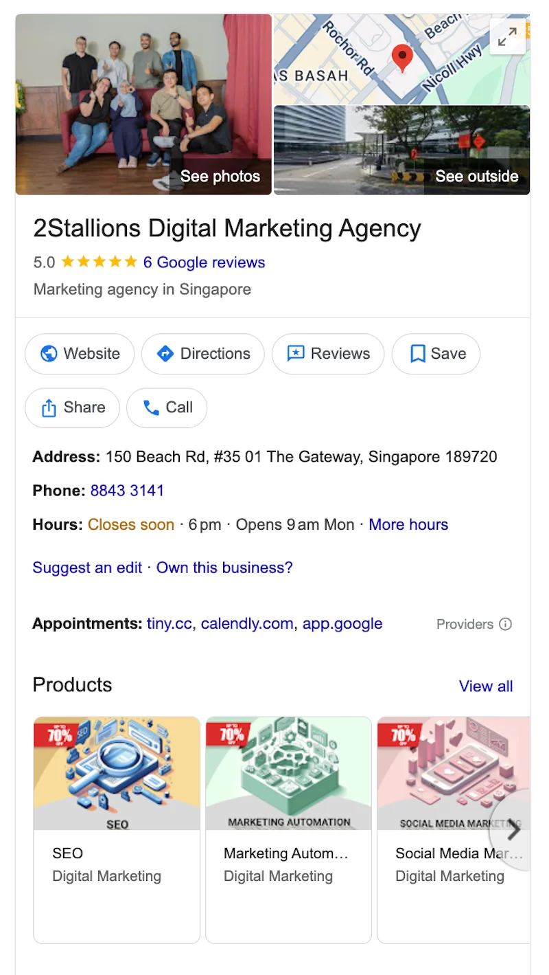 Reviews are a powerful trust signal for both Google and your potential customers. Businesses with the highest number of reviews and average ratings tend to appear higher in the local search results. For Singaporean consumers, the number of reviews and ratings often become the deciding factor when comparing many competing businesses.