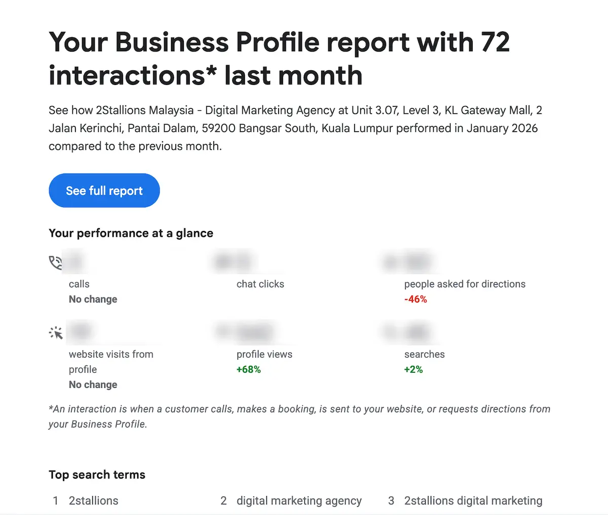 - GMB Performance Reports: Admin accounts of your Google My Business (GMB) would receive a monthly report tracking the number of calls, direction requests, and website clicks from your profile.