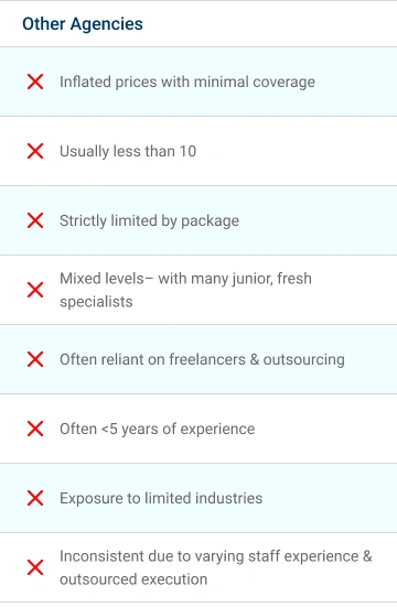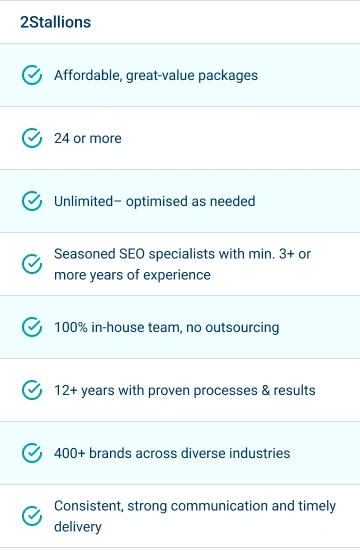 At 2Stallions, your campaigns wonโt be passed off to junior staff or outsourced freelancers. Every SEO specialist in our team has at least 3 years or more of hands-on experience, with extensive expertise across industries.